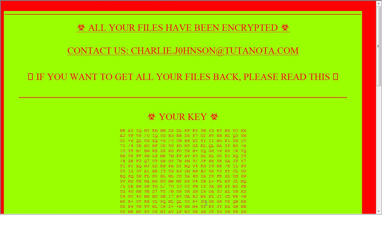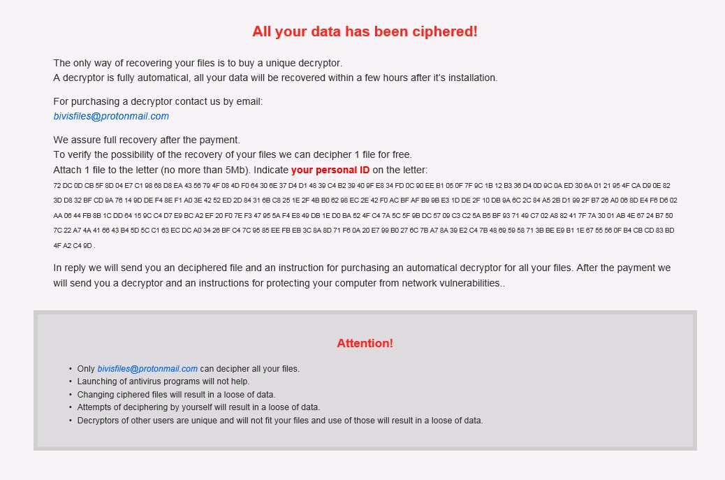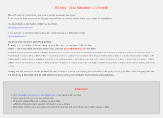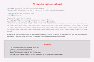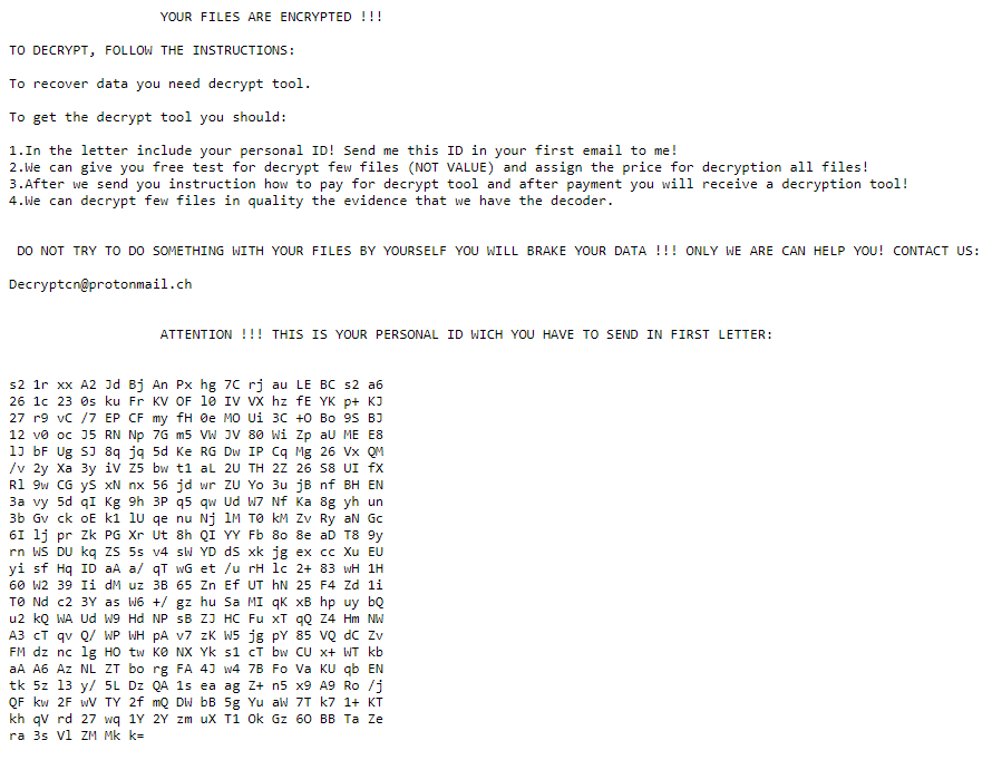 Этот крипто-вымогатель шифрует данные пользователей с помощью SHACAL-2 (но в коде есть что-то от SHA-512 и SHA-224), а затем требует выкуп в # BTC, чтобы вернуть файлы. Оригинальное название: в записке не указано. На файле написано: нет данных.