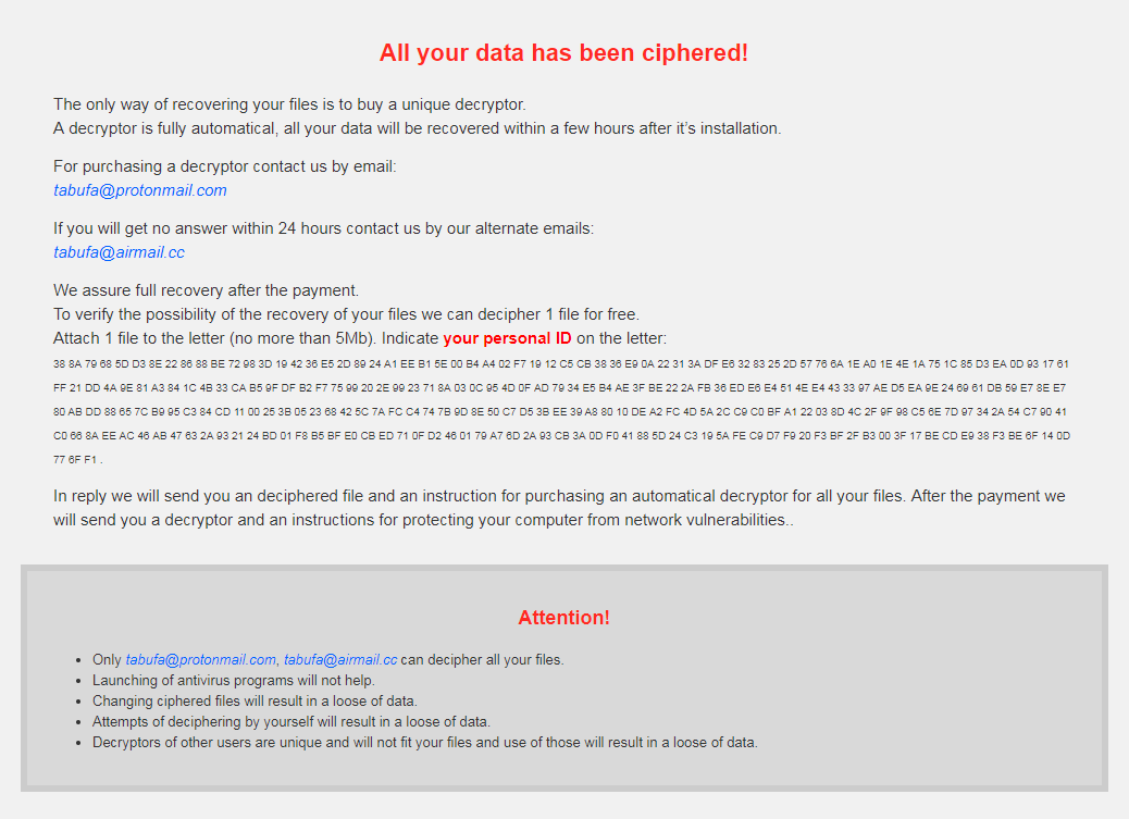 Only tabufa@protonmail.com, tabufa@airmail.cc can decipher all your files.