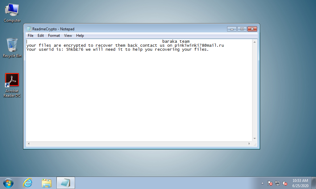 Этот крипто-вымогатель шифрует данные пользователей с помощью AES, а затем требует выкуп написать на email, чтобы узнать как вернуть файлы. Оригинальное название: в записке не указано. На файле написано: tk3787.exe или DDESHARE.EXE. Написан на AutoIt.
