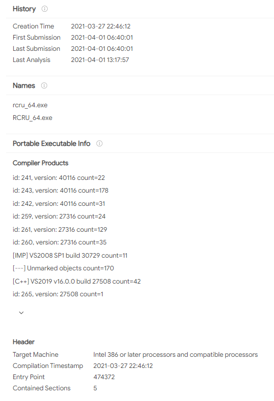 Этот крипто-вымогатель шифрует данные пользователей с помощью AES-256 GCM и RSA-2048, а затем требует выкуп в # BTC, чтобы вернуть файлы. Оригинальное название: в записке не указано. На файле написано: RCRU64.exe, rcru_64.exe, Desktopini.exe. Использует библиотеку Crypto++.