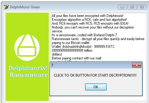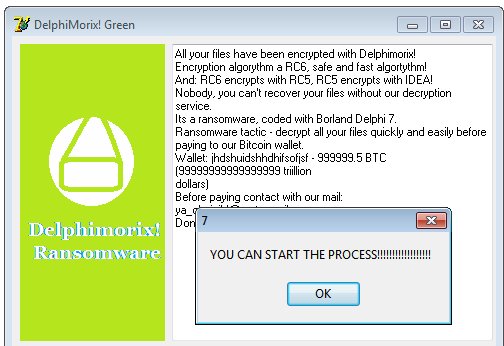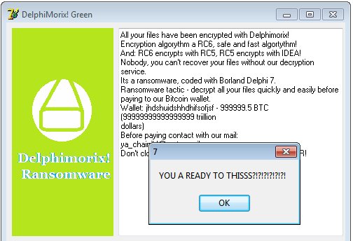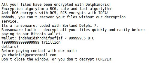 Этот крипто-вымогатель шифрует данные пользователей с помощью AES, а затем требует выкуп в 0.5 BTC, чтобы вернуть файлы. Оригинальное название: cmdRansomware. На файле написано: crypren.exe